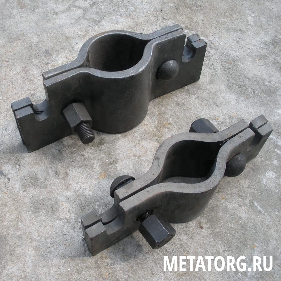 В конструкцию хомутов входит 2 части: толстые пластины из стали согнуты по центру аналогично форме трубы в соответствии с ее диаметром. Также есть пазы, в которые устанавливаются стропы (съемные).